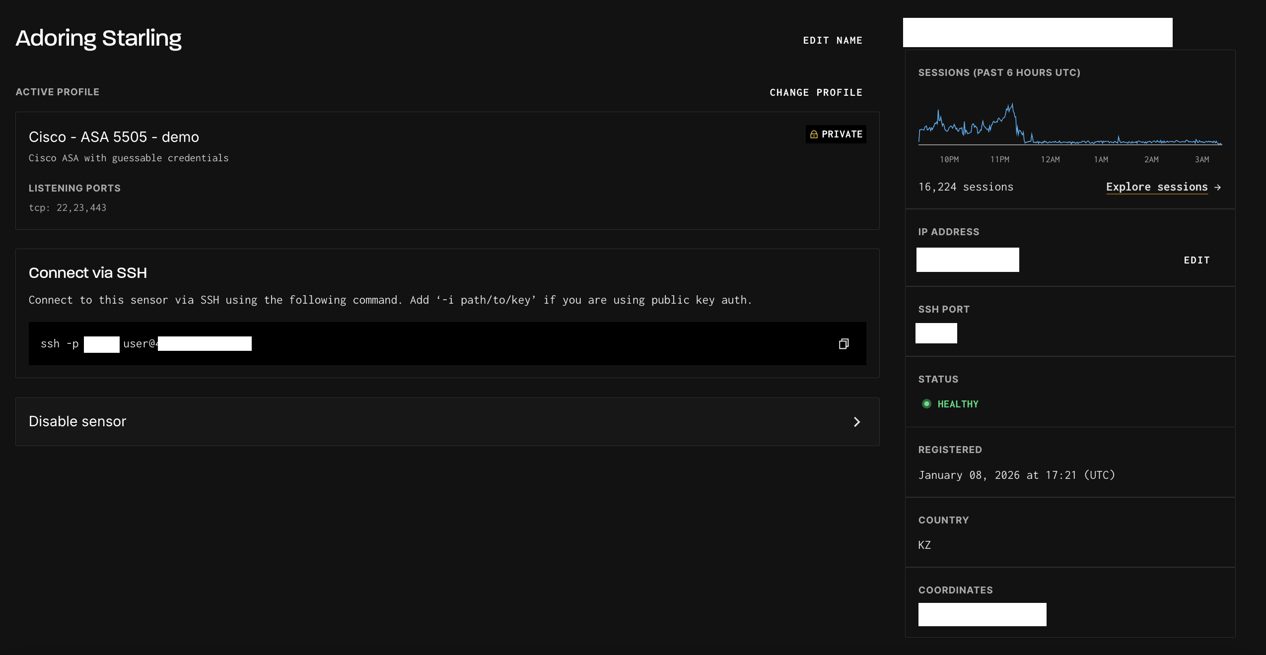 - See the sensor’s IP address, SSH port, registration date, and coordinates
